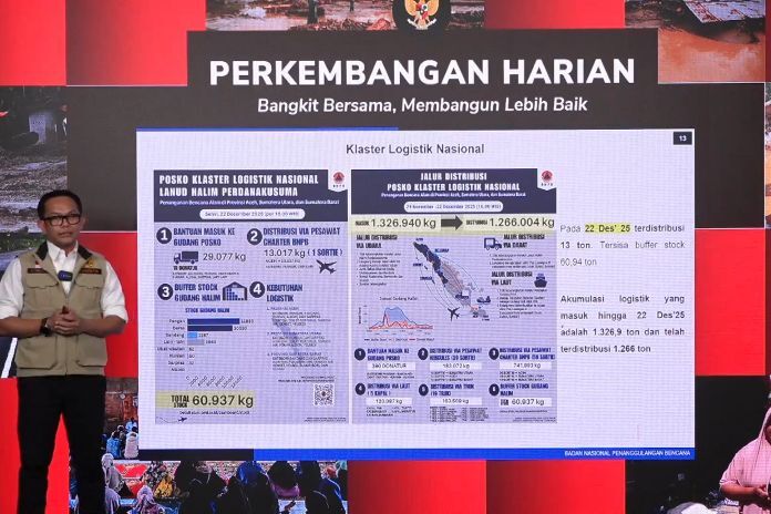 Dalam konferensi pers di Jakarta, Selasa (23/12), Kepala Pusat Data, Informasi, dan Komunikasi Kebencanaan BNPB Abdul Muhari menyampaikan total logistik yang telah masuk ke Posko Banjir Sumatra di Pangkalan Udara Halim Perdanakusuma Jakarta mencapai 1.326 ton.