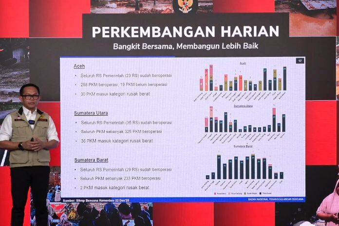 “Dari sisi pelayanan kesehatan, seluruh rumah sakit pemerintah di Aceh telah beroperasi,” ujar Kepala Pusat Data, Informasi, dan Komunikasi Kebencanaan BNPB Abdul Muhari dalam konferensi pers di Jakarta, Selasa (23/12).