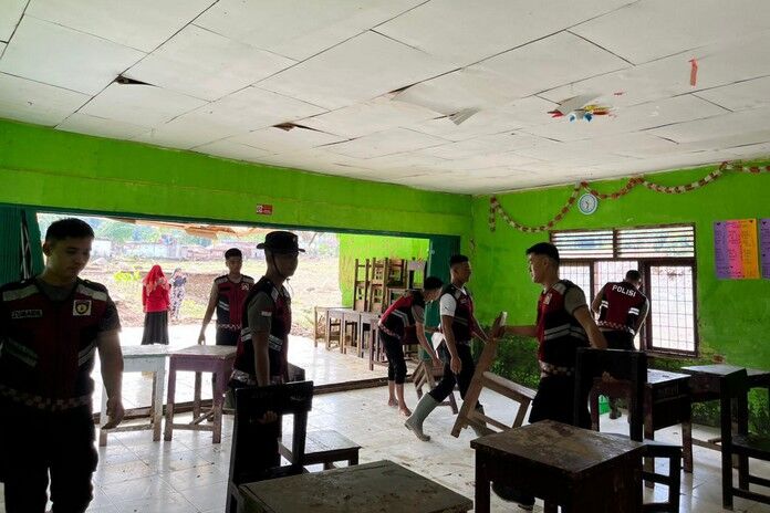 Dengan menggunakan pacul dan peralatan seadanya, personel Brimob mengeluarkan kursi dan meja dari dalam kelas sebelum membersihkan bagian dalam sekolah secara menyeluruh, agar aktivitas belajar mengajar dapat segera kembali berjalan.