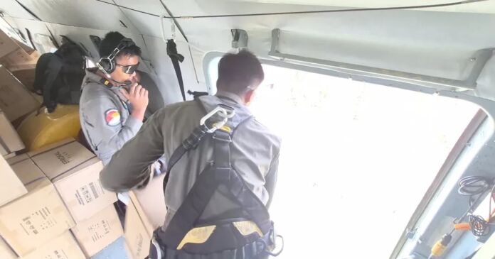 Kodam Iskandar Muda menyalurkan total 1,5 ton bantuan logistik berisi makanan serta obat-obatan bagi warga yang terdampak bencana di Kota Langsa, Kabupaten Aceh Timur menggunakan Helikopter MI-17 V5 bernomor registrasi HA-5157 dari Lanud Sultan Iskandar Muda, Selasa (2/12). (Foto Dok. Badan Komunikasi Pemerintah)
