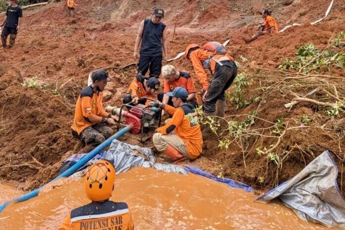 Para relawan mencoba menyedot air bercampur lumpur untuk memudahkan evakuasi korban longsor.