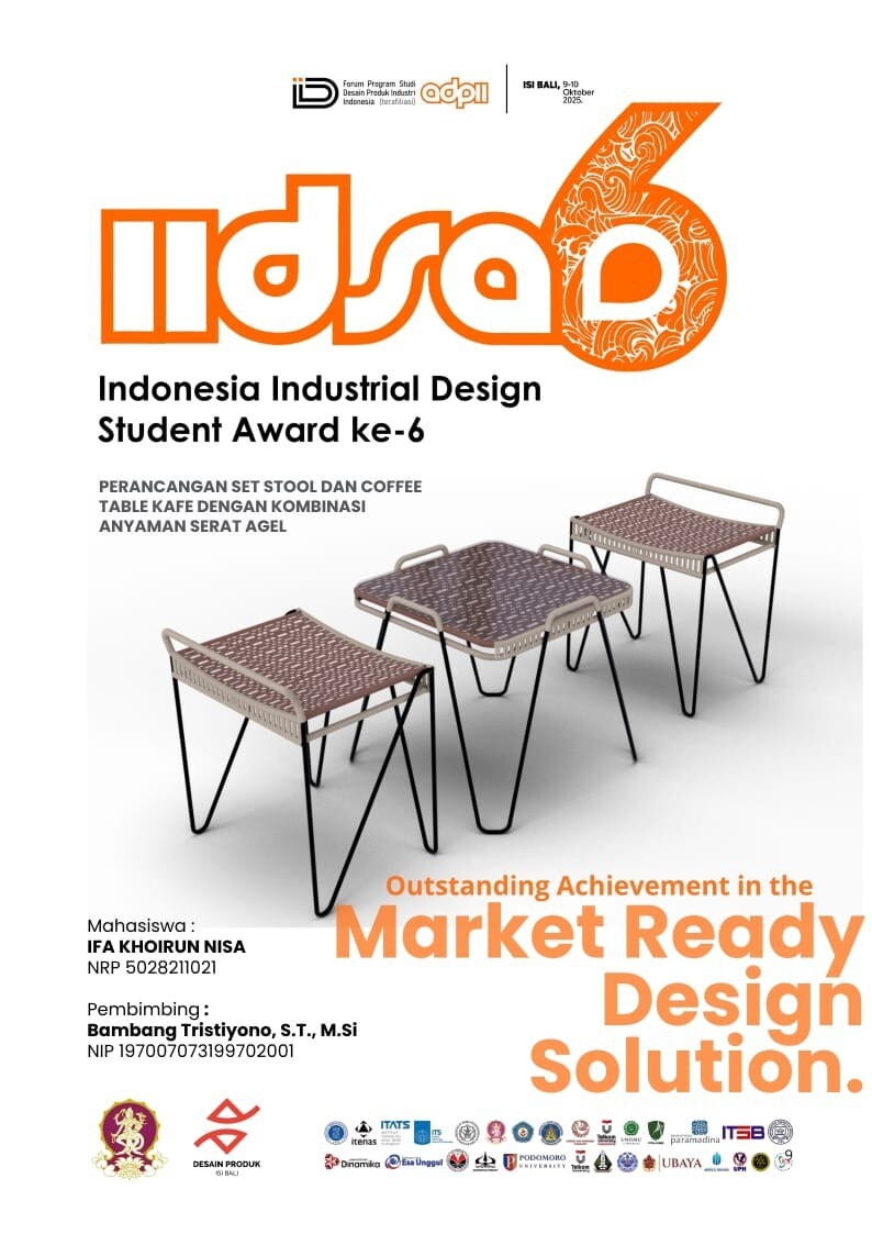 Kategori ketiga adalah Market Ready Design Solution yang mengusung karya berjudul Perancangan Set Stool dan Coffee Table Kafe dengan Kombinasi Serat Agel untuk Kebutuhan Sustainable Furniture.