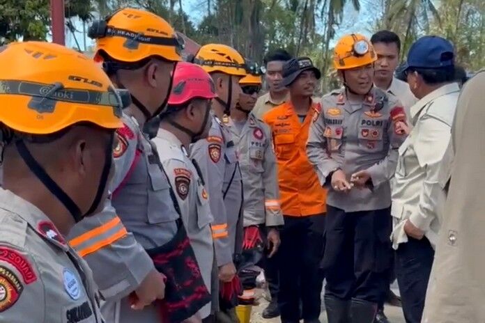 Presiden RI Prabowo Subianto sempat menghentikan laju mobil kepresidenan saat dalam perjalanan menuju jembatan bailey Sungai Garoga, Batang Toru, Tapanuli Selatan, Rabu (31/12) untuk menyapa beberapa petugas polisi yang masih bekerja dengan anjing K-9 untuk terus mencari korban hilang di wilayah itu. (Foto Dok. Badan Komunikasi Pemerintah)