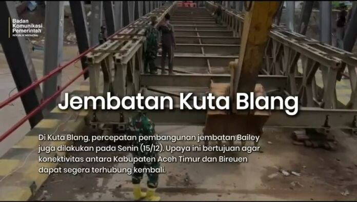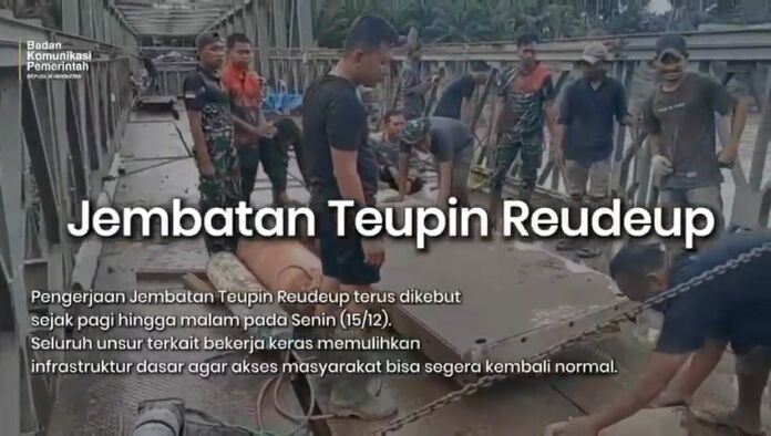 Pemerintah terus bergerak cepat dalam pemulihan di sejumlah wilayah terdampak bencana di Aceh, Sumatera Utara, dan Sumatera Barat. Perbaikan infrastruktur menjadi prioritas, mengingat ini menjadi sarana vital dalam distribusi bantuan. Jembatan menjadi salah satu infrastruktur yang perbaikannya dipercepat. (Foto Dok. Badan Komunikasi Pemerintah)
