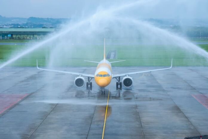 Bandara Internasional Jenderal Ahmad Yani Semarang melakukan tradisi water salute kepada maskapai Scoot yang baru saja mendarat.