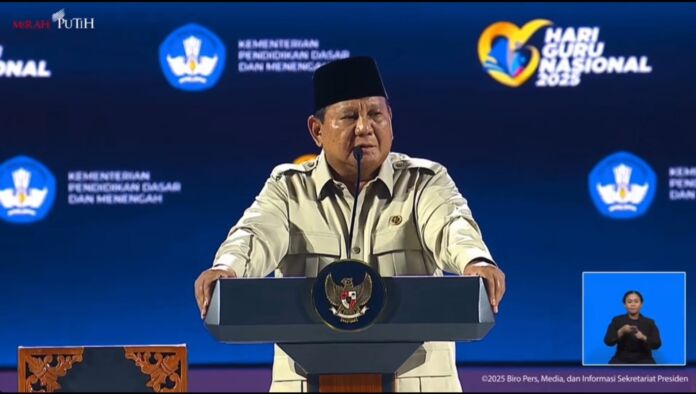 Presiden RI Prabowo Subianto mengumumkan pembentukan Satuan Tugas (Satgas) Darurat Jembatan sebagai langkah percepatan untuk memperkuat akses jalan para pelajar menuju sekolah di seluruh pelosok Indonesia. Hal ini disampaikan Prabowo pidatonya pada peringatan Hari Guru Nasional (HGN) 2025 di Indonesia Arena, Kompleks Gelora Bung Karno (GBK), Jakarta, Jumat (28/11). (Foto Dok. Badan Komunikasi Pemerintah)