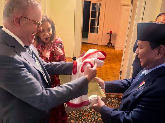 Momen itu terekam dalam foto dan video yang diunggah akun @sekretariat.kabinet, dikutip Kamis (13/11). Albanese tampak senang menerima hadiah dari Prabowo untuk Toto. Ia tertawa saat membuka kado tersebut.