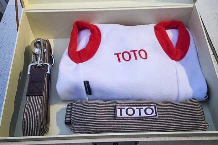 Di dalam kotak itu, ada baju kaos dengan warna dasar putih dan pinggiran warna merah. Pada bagian depan kaos terdapat tulisan “TOTO” warna merah, sementara di bagian belakangnya terdapat gambar anjing dan kucing. Selain itu, ada satu set tali garis-garis juga dengan tulisan “TOTO”.