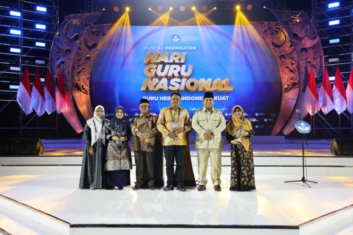 Jakarta, Idola 92.6 FM-Presiden RI Prabowo Subianto menganugerahkan penghargaan kepada tiga pengajar berprestasi pada puncak peringatan Hari Guru Nasional (HGN) 2025 yang digelar di Indonesia Arena, kawasan Gelora Bung Karno (GBK), Jakarta. Dalam sambutannya, Prabowo menegaskan kualitas pendidikan Indonesia tidak akan pernah maju tanpa peran guru yang berdedikasi.