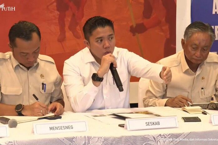 Sekretaris Kabinet Teddy Indra Wijaya menegaskan bahwa pemerintah sejak awal telah melakukan penanganan skala nasional untuk memulihkan wilayah-wilayah yang terdampak bencana banjir di Sumatra Utara (Sumut), Aceh, dan Sumatra Barat (Sumbar). Hal itu disampaikan Teddy dalam konferensi pers di Lanud Halim Perdanakusuma, Jakarta, Jumat (19/12). (Foto Dok. Badan Komunikasi Pemerintah)