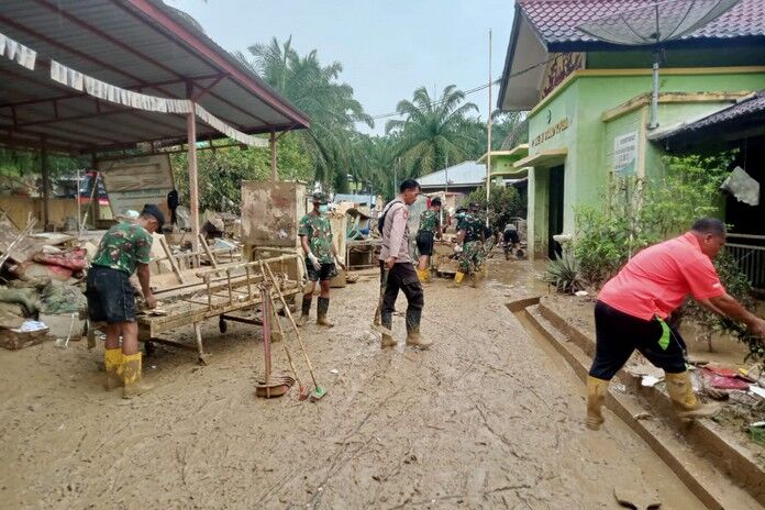 Para prajurit TNI bahu-membahu mengangkat lumpur, menyemprot ruang kelas dengan air bersih, serta membersihkan lingkungan sekolah. Lumpur tebal yang mengendap di lantai, meja belajar, hingga dinding kelas dibersihkan meski dengan peralatan seadanya.