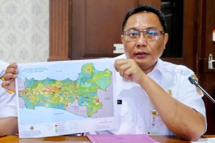 Kepala Dinas ESDM Jateng Agus Sugiharto menunjukkan peta sebaran potensi longsor di wilayah Jateng.