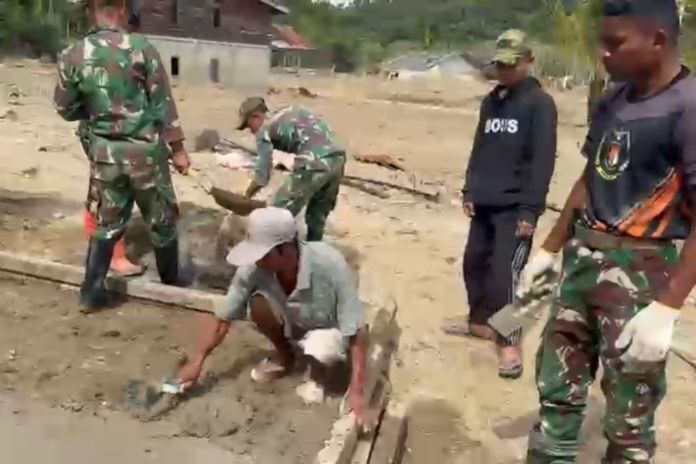 Berdasarkan pantauan pada Senin (16/2), tampak para personel TNI sedang menyiapkan lokasi serta mengaduk semen untuk masjid sementara. Warga setempat turut membantu meratakan semen.