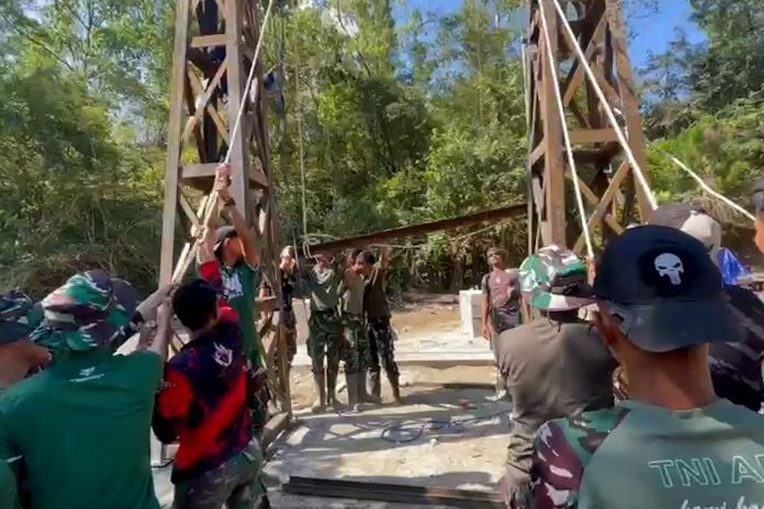 Lalu di Desa Kala Ili, Kecamatan Linge, Aceh Tengah, prajurit TNI bahu-membahu menarik tiang baja penyangga untuk jembatan gantung.