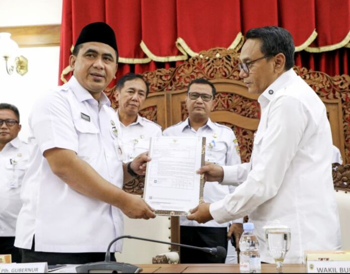 Wagub Taj Yasin menyerahkan surat keputusan penunjukkan Wakil Bupati Pati Risma Ardhi Chandra menjadi Pelaksana Tugas (Plt) Bupati.
