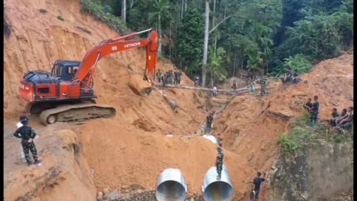Di Desa Hutanabolon, personel TNI juga memperbaiki jalan yang terdampak bencana di Tukka, Tapanuli Tengah. Material lumpur yang sudah mengeras dibersihkan dan diangkut dengan truk. Fasilitas umum lainnya di Tukka yang dibersihkan adalah SDN 152892 dan SDN 152981. (her/dav)